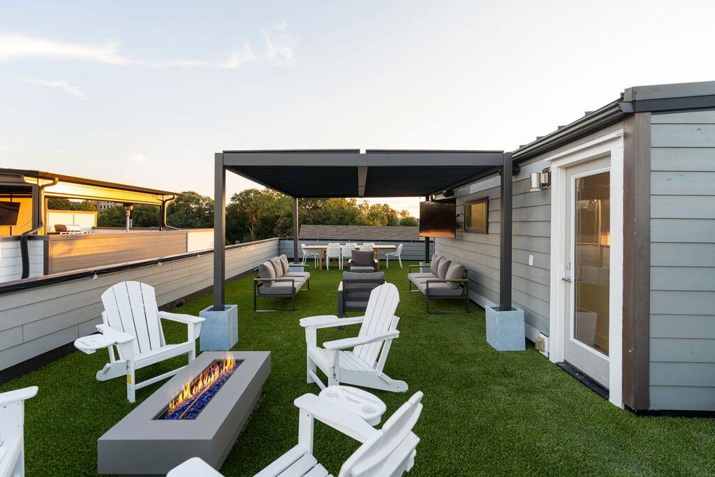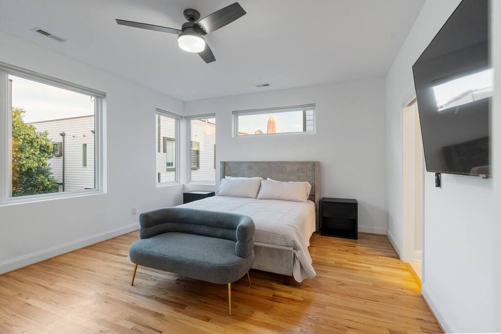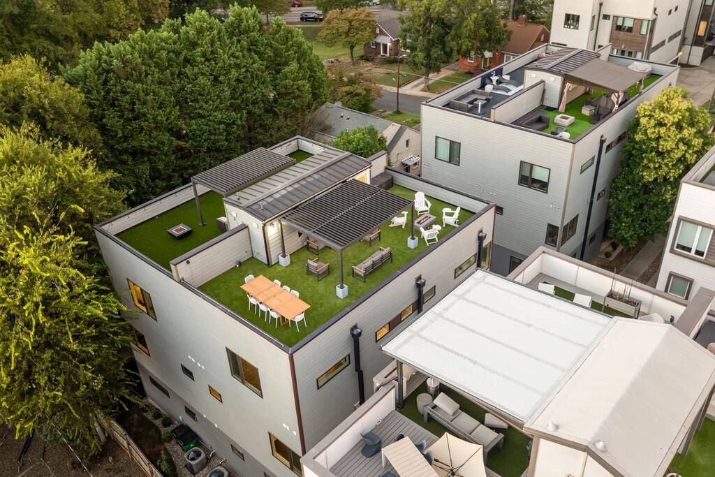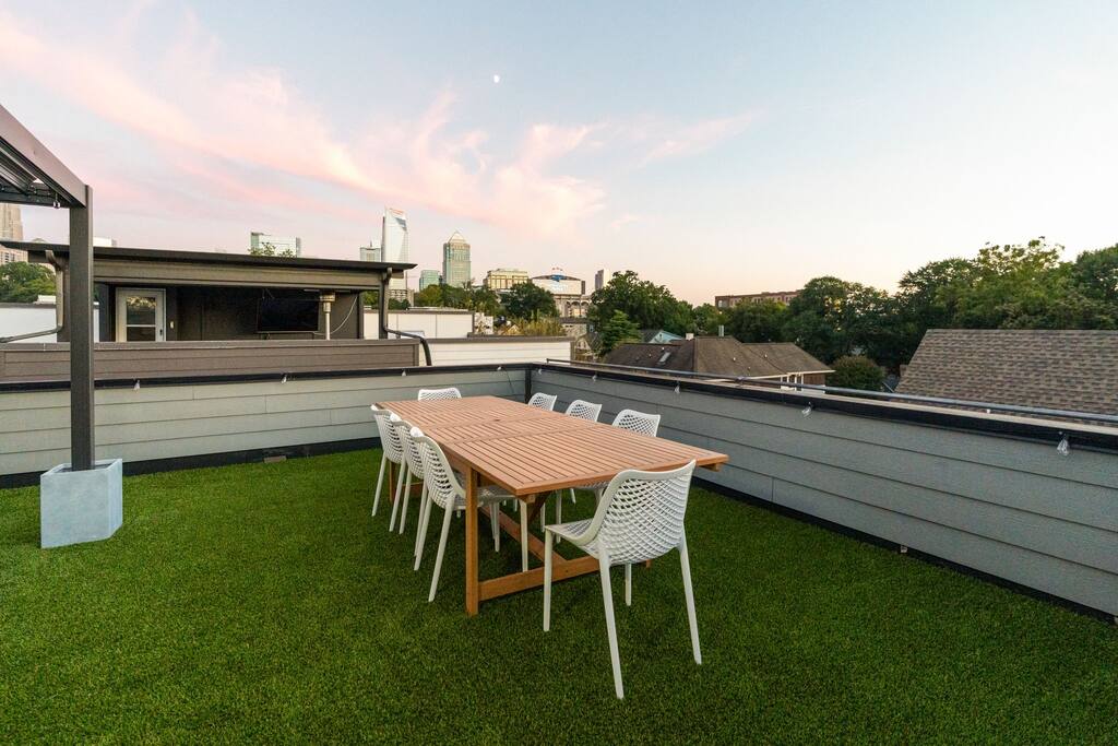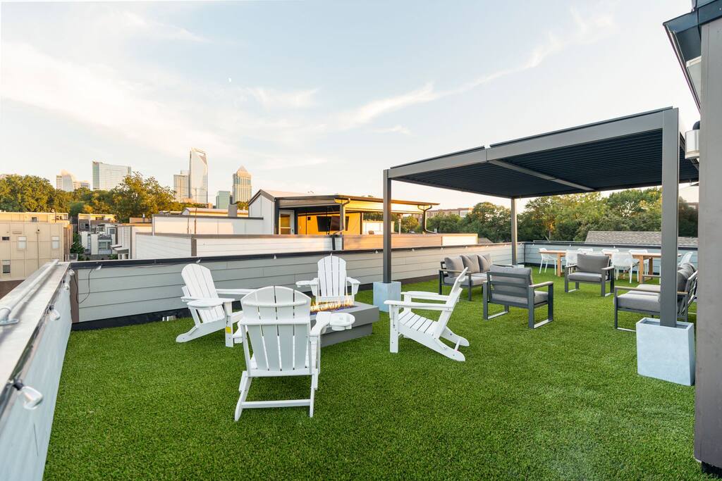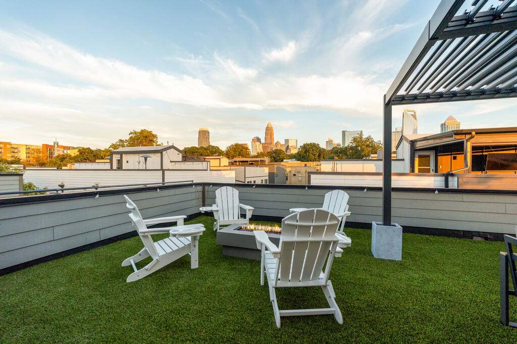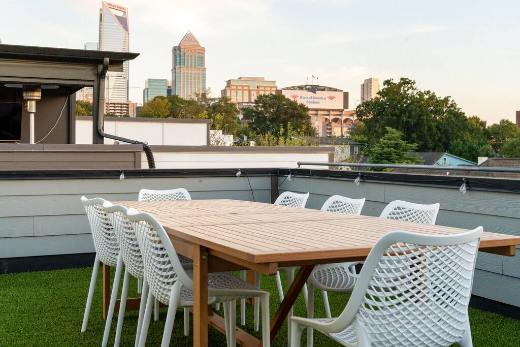 The Uptown Terrace, a perfect getaway nestled in Uptown Charlotte. This 4 story modern condo features a 800sqft rooftop terrace with amazing city views. It’s the perfect place to sip your coffee in the morning or pregame for events at BOA Stadium/Truist Field. BTW, it is only a 12 min walk! Ideal for both relaxation and adventure. -Watch the fireworks from your private rooftop. -3 king bedrooms each with private bathrooms. -Fully stocked kitchen -High-speed WiFi -2car garage + additional spot