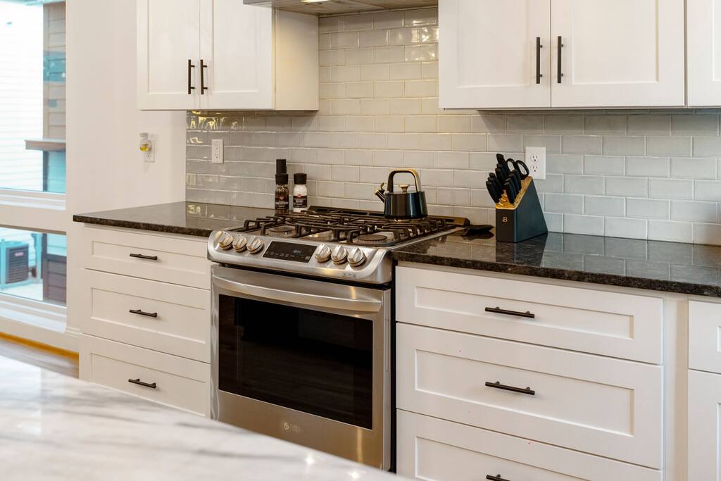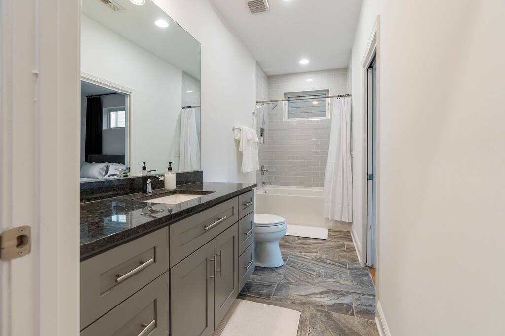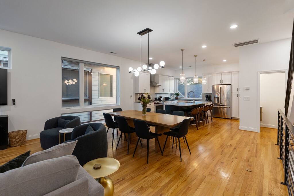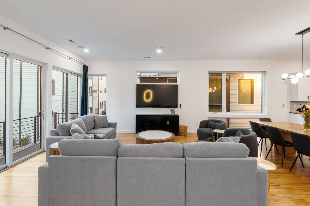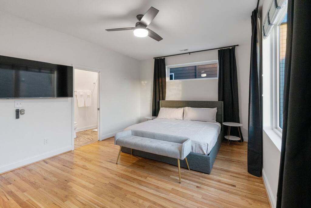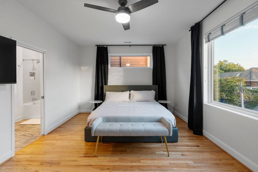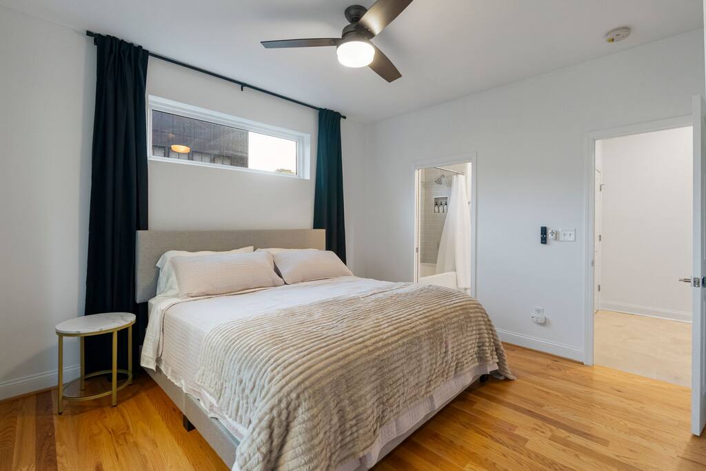 The Uptown Terrace, a perfect getaway nestled in Uptown Charlotte. This 4 story modern condo features a 800sqft rooftop terrace with amazing city views. It’s the perfect place to sip your coffee in the morning or pregame for events at BOA Stadium/Truist Field. BTW, it is only a 12 min walk! Ideal for both relaxation and adventure. -Watch the fireworks from your private rooftop. -3 king bedrooms each with private bathrooms. -Fully stocked kitchen -High-speed WiFi -2car garage + additional spot