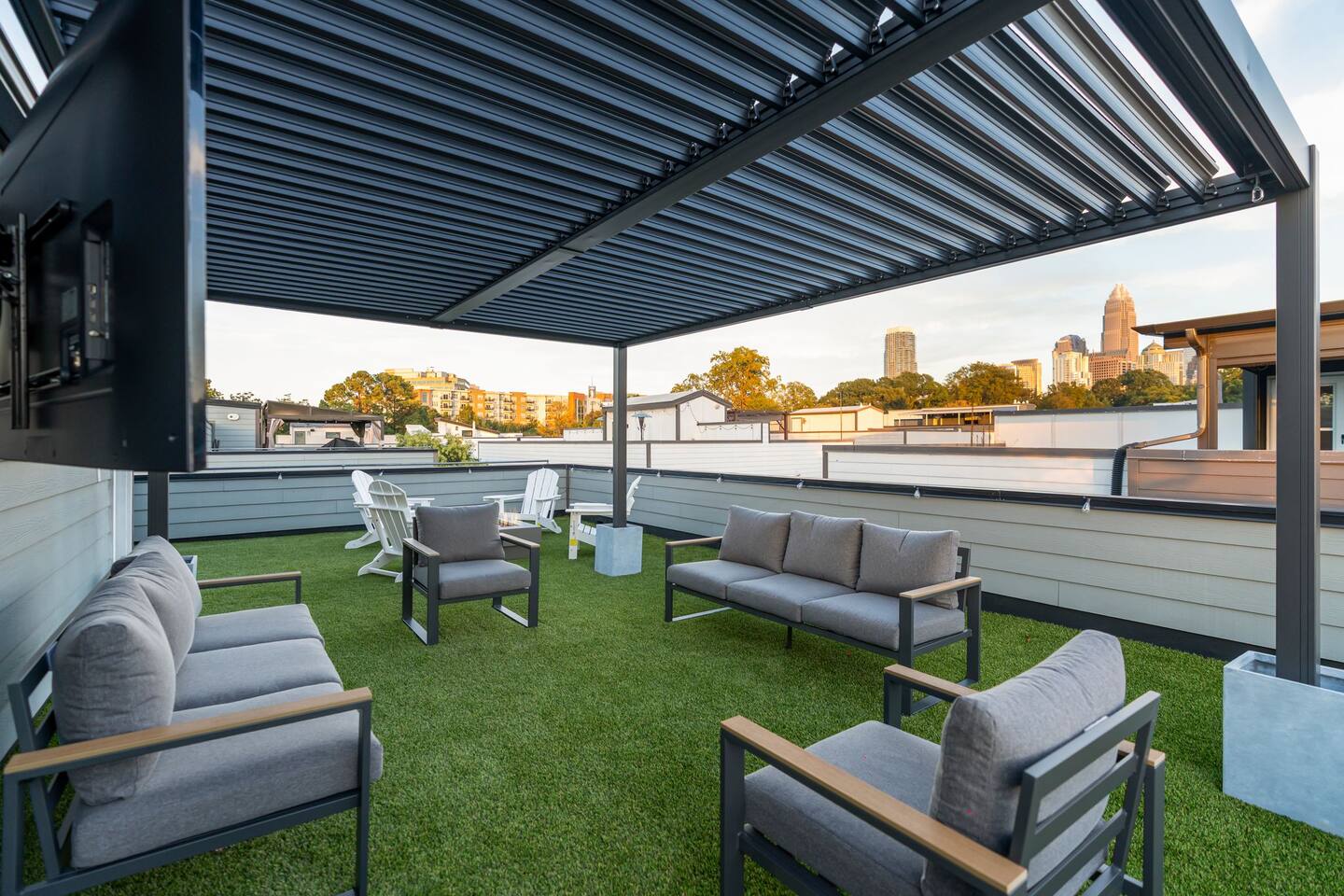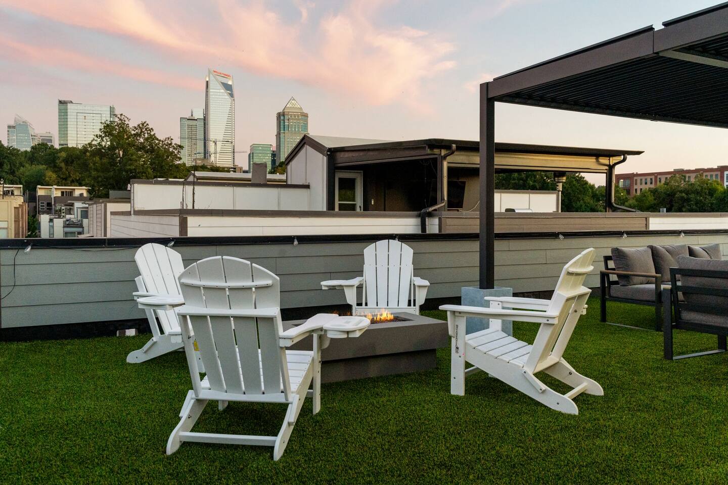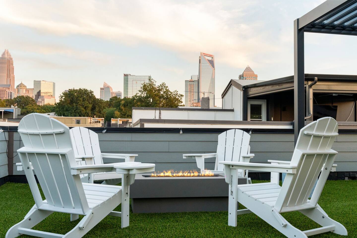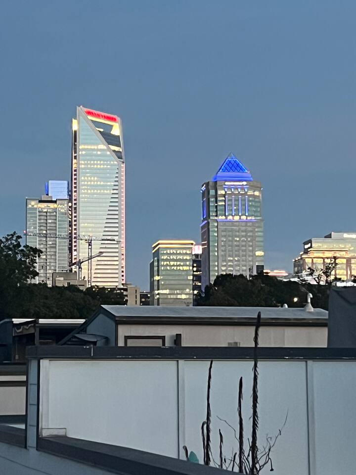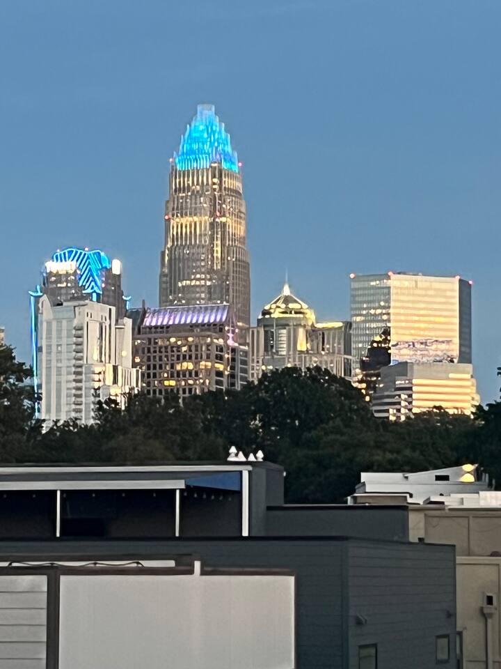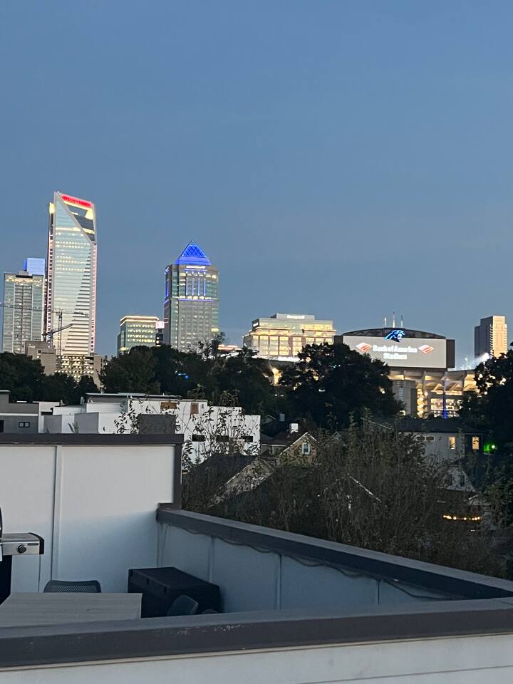 The Uptown Terrace, a perfect getaway nestled in Uptown Charlotte. This 4 story modern condo features a 800sqft rooftop terrace with amazing city views. It’s the perfect place to sip your coffee in the morning or pregame for events at BOA Stadium/Truist Field. BTW, it is only a 12 min walk! Ideal for both relaxation and adventure. -Watch the fireworks from your private rooftop. -3 king bedrooms each with private bathrooms. -Fully stocked kitchen -High-speed WiFi -2car garage + additional spot
