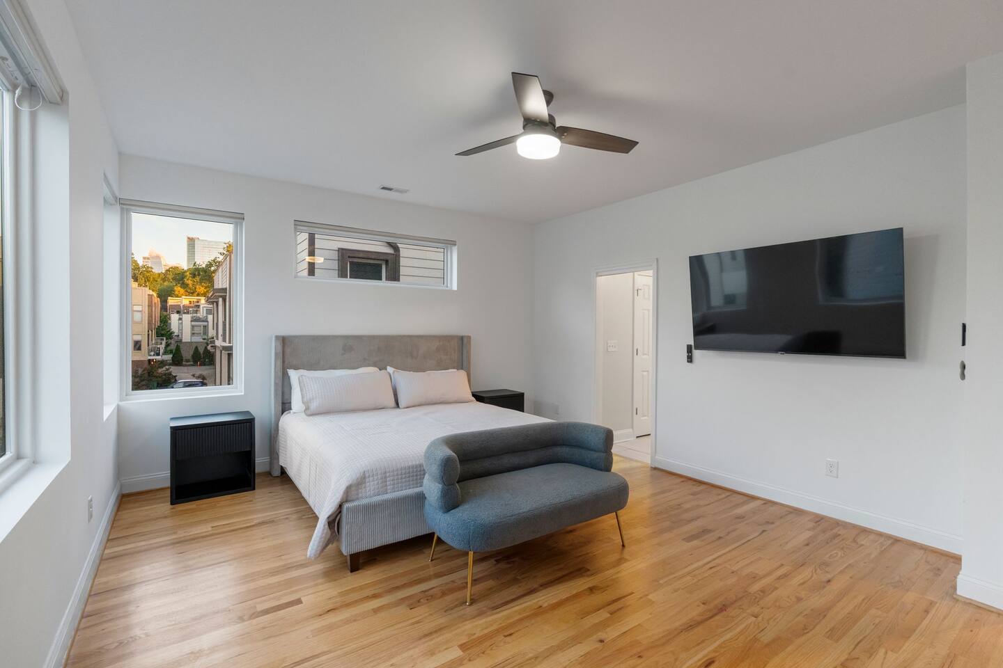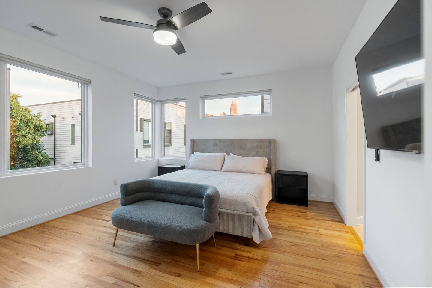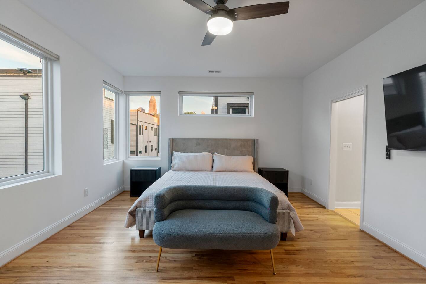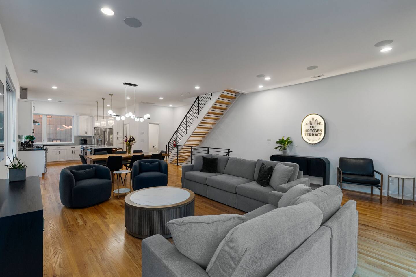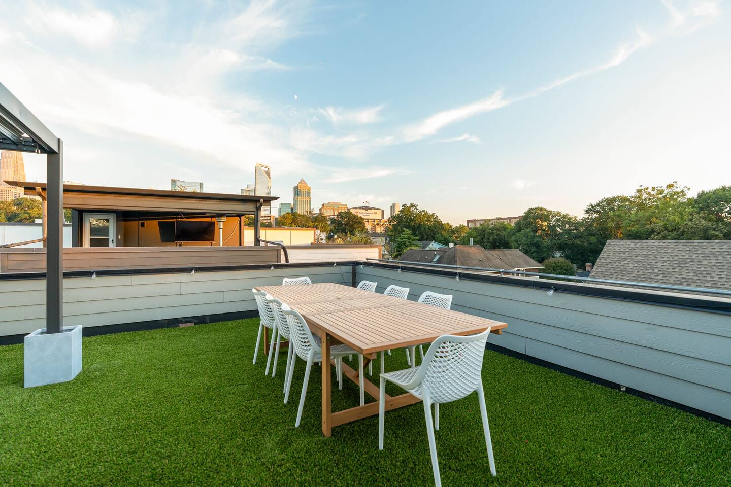 The Uptown Terrace, a perfect getaway nestled in Uptown Charlotte. This 4 story modern condo features a 800sqft rooftop terrace with amazing city views. It’s the perfect place to sip your coffee in the morning or pregame for events at BOA Stadium/Truist Field. BTW, it is only a 12 min walk! Ideal for both relaxation and adventure. -Watch the fireworks from your private rooftop. -3 king bedrooms each with private bathrooms. -Fully stocked kitchen -High-speed WiFi -2car garage + additional spot