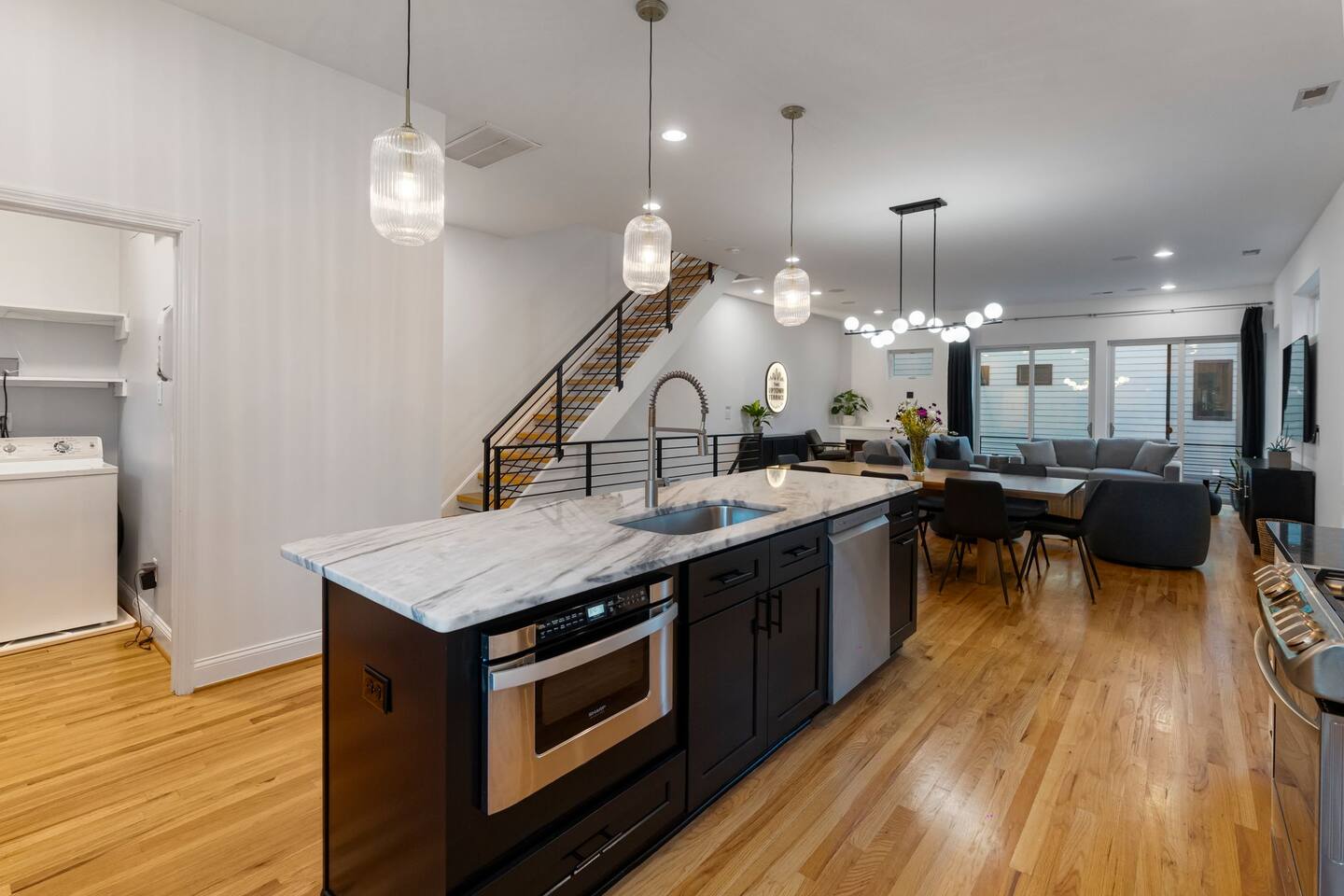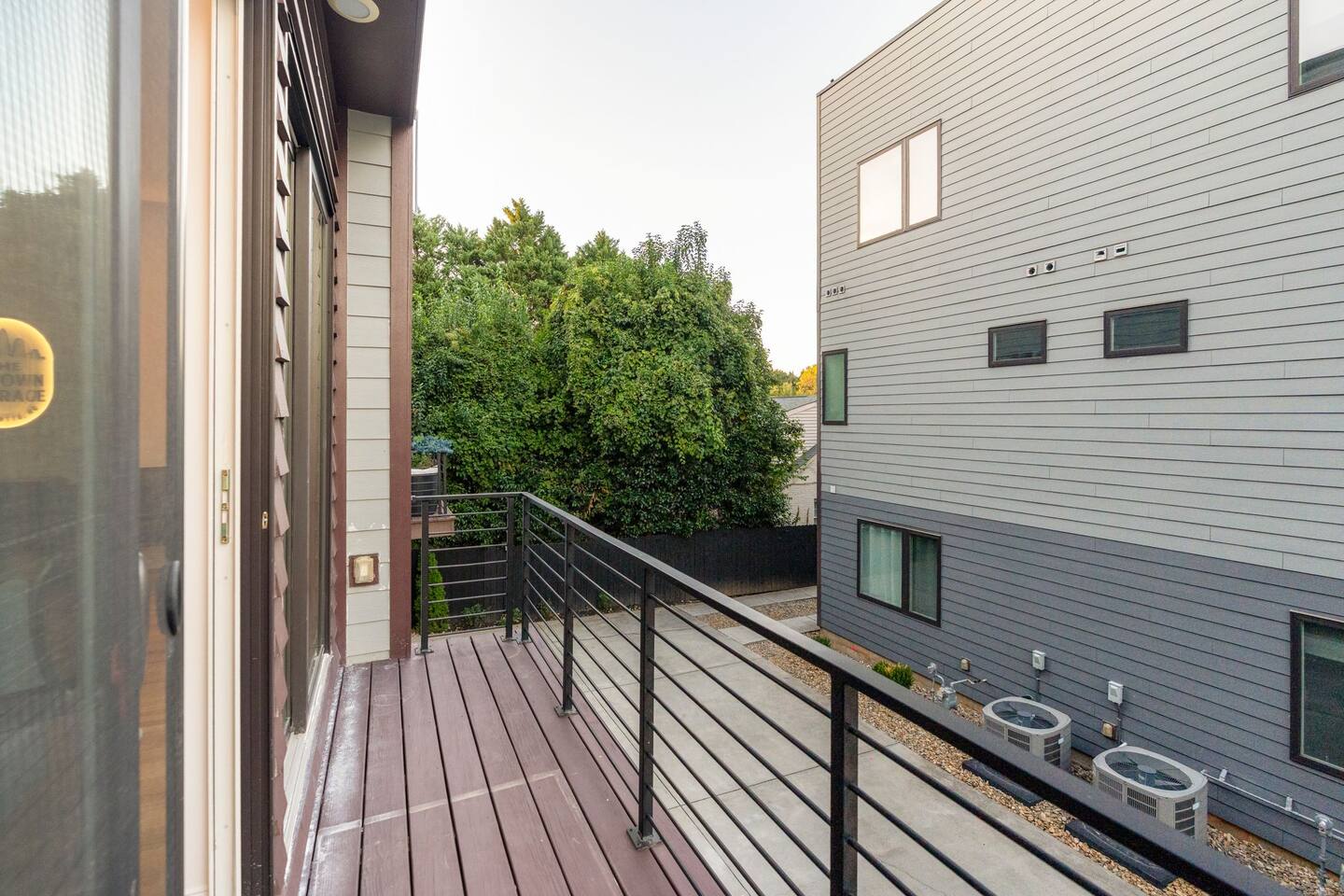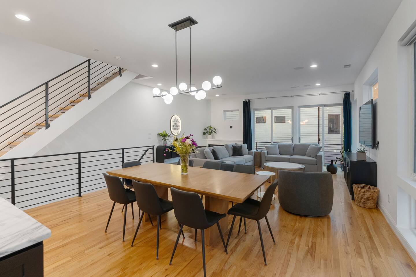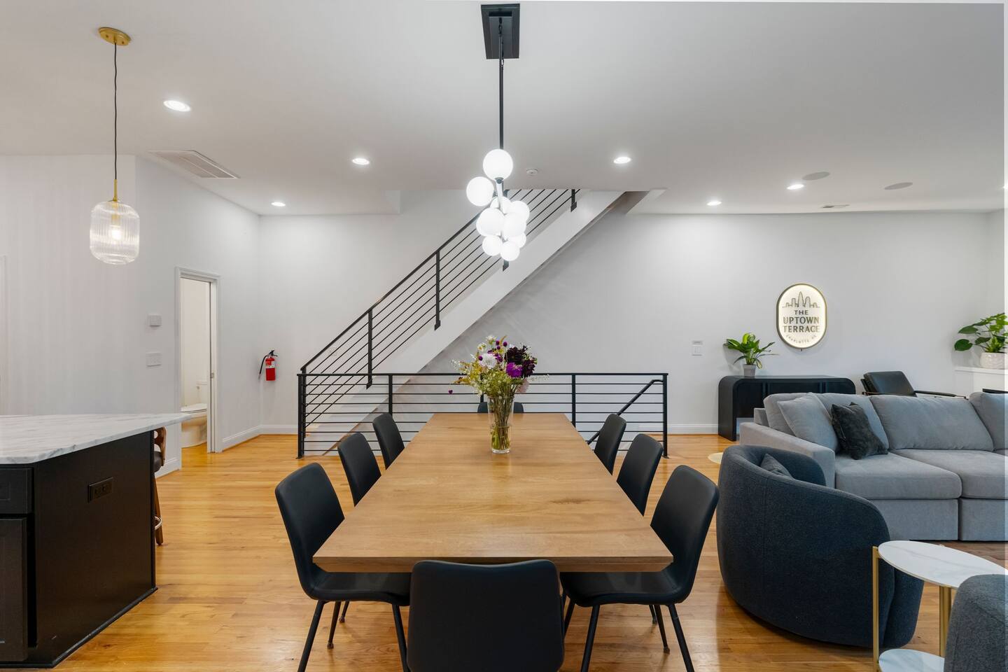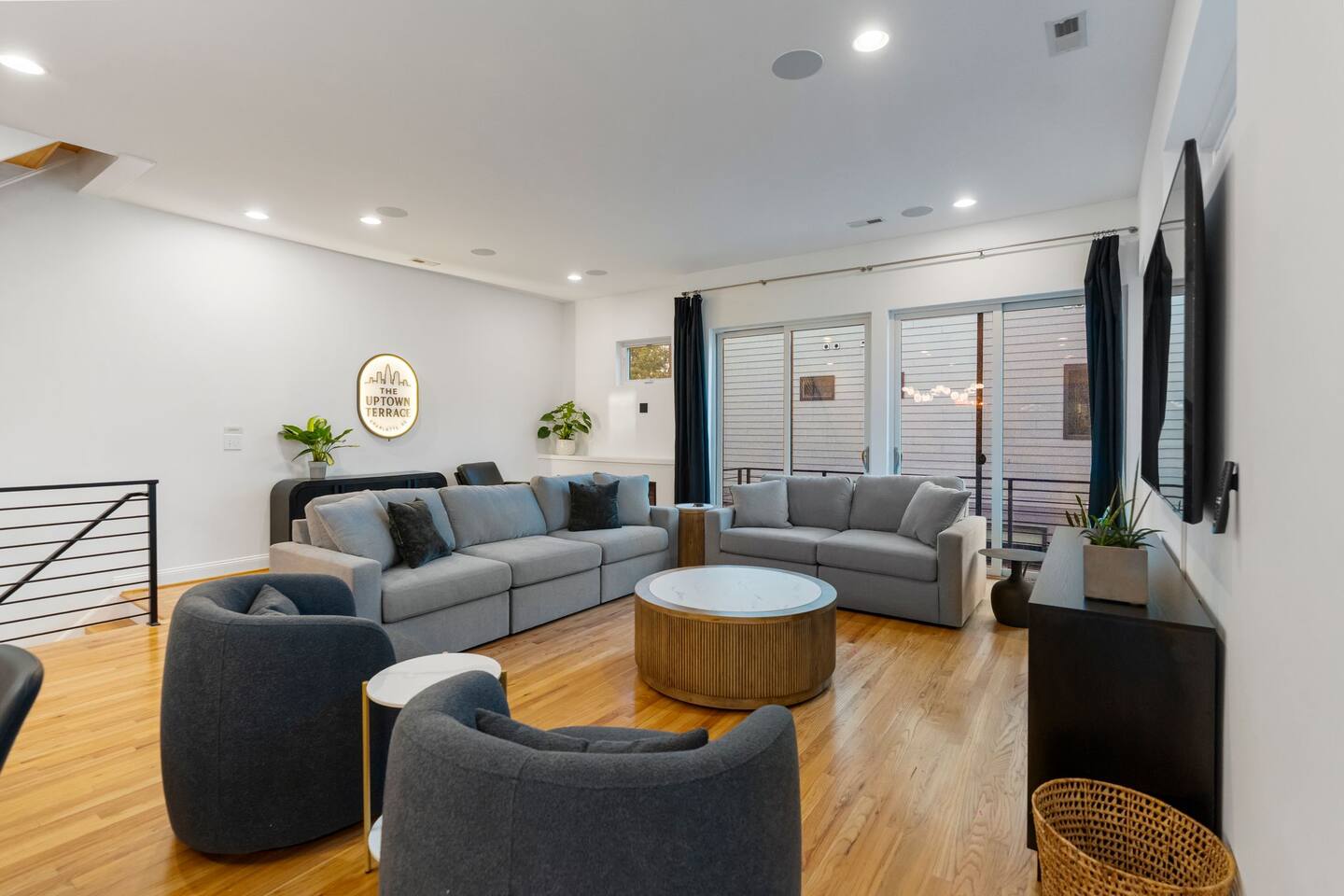 The Uptown Terrace is a 4 story condo with a 2 car garage. On the main floor is a bedroom and private bathroom. There is an entry way with a coat closet with hangers. On the 2nd floor there is a living room with seating for 6, a dining area with seating for 8, and a fully equipped kitchen with an island that seats 4 guests. There is also a laundry room with washer, dryer, iron/board. There is a powder bathroom for convenience in this floor. On the 3rd floor there is the master bedroom with double sinks and a 2 person shower. This bedroom has 2 closets. There is an additional guest bedroom with private bathroom and a linen closet as well. Up the final staircase is the Grand Finale, the Rooftop Terrace. Plenty of seating, 65” tv, firepit, dining area for 8 guests, and AMAZING CITY VIEWS. NO PARTIES ALLOWED. NO SMOKING/VAPING in the Perrier or on the rooftop